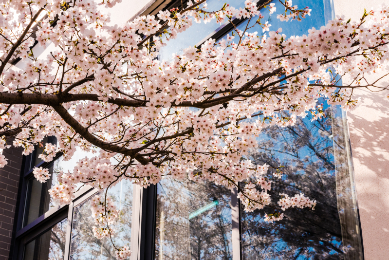 大道两旁绿树成荫,小径两边繁花飞舞。校园内,清雅的玉兰伴着娇艳的桃花,更有早樱的花瓣零星散落,空气中弥漫着阵阵芬芳,共同诉说着对春天的希望。
