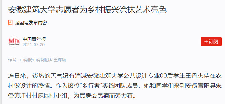 编者按:近日,我校开展“万名大学生服务乡村振兴”行动,为安徽舒城县、黄山市、池州市等地提供村庄规划、建筑改造、景观提升、室内装饰、视觉包装设计,得到当地政府部门和群众的一致认可。7月20日,中国青年报对此进行了报道。