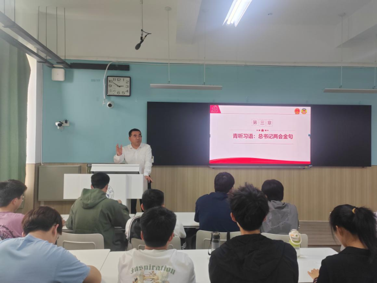 蔡国军围绕2025年全国两会的举行、政府工作报告内容等方面对两会精神进行宣讲,同时,带领学子们学习了习近平总书记在两会期间的“金句”。他结合两会精神,以深入浅出的语言和鲜活的实例指出,作为新时代青年应树立远大理想,增强使命担当,在进一步全面深化改革的新征程中与时代同行,要关注科技前沿,拓宽国际视野,夯实专业基础,争做科技人才,勇于创新探索。他希望同学们积极参与社会实践,学会解决实际问题,培养团队合作精神,强化沟通能力。