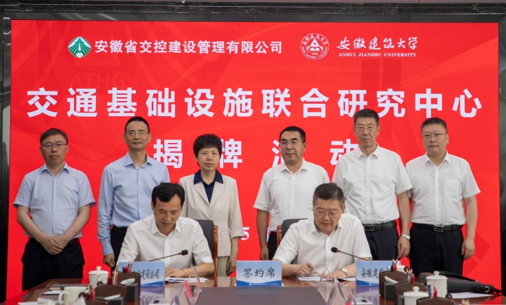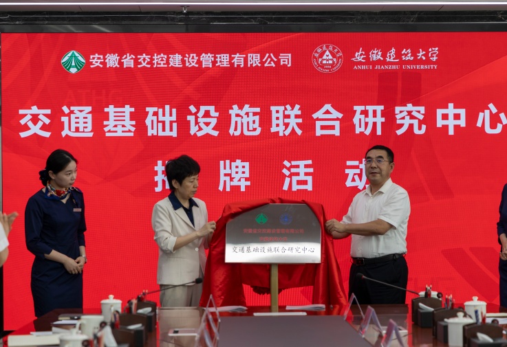 校科技成果转化处处长仲勇与建设管理有限公司总经理王传宝代表双方签署框架合作协议。蔡国军与李小彦共同为“交通基础设施联合研究中心”揭牌。