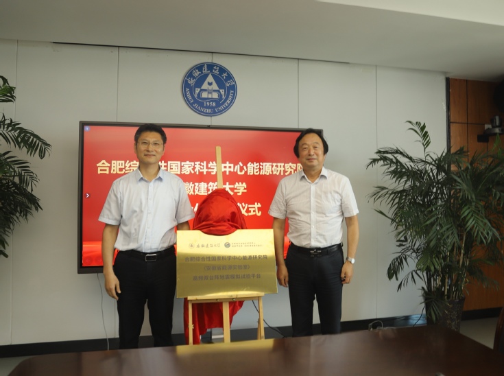 李建刚与马文革共同为“合肥综合性国家科学中心能源研究院(安徽省能源实验室)高频双台阵地震模拟试验平台”揭牌。