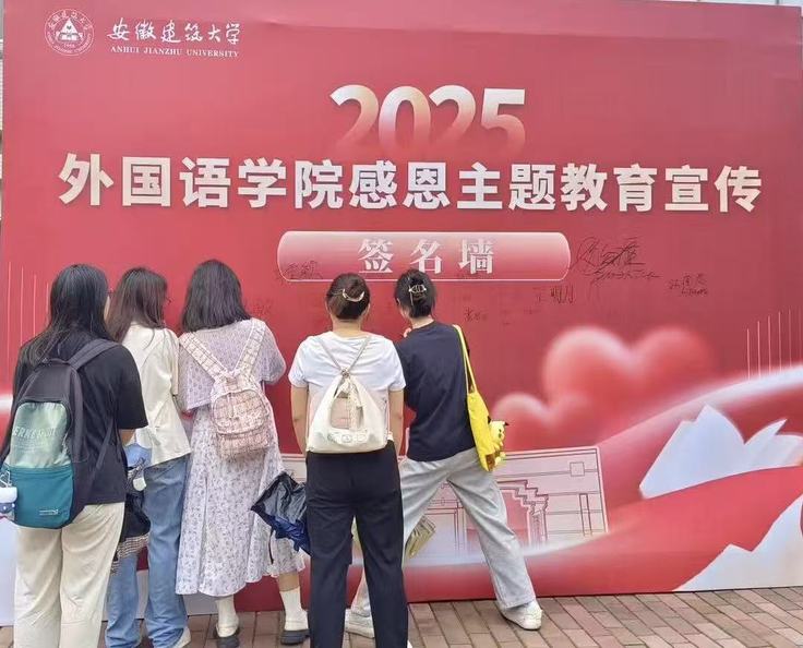 为引导学生将感恩之情转化为具象表达,让“感恩于心、回馈于行”的理念深入人心。外国语学院在北食堂门前设感恩育人签名墙。学生们有序排队签名,手持签字笔郑重写下自己的名字与感恩寄语:“感谢国家资助,让我能安心追逐学术梦想!”“以青春之力回馈社会,不负每份关怀!”。值得一提的是,不少非受助学生深受感染,也主动参与其中,在签名墙写下“感恩不分你我”“与爱同行”等暖心话语。短短一上午,3米多长的签名墙便布满了密密麻麻的签名与寄语,每一笔都承载着青春的温度与成长的力量,更让“感恩”“珍惜”的种子在学生心中悄然扎根。