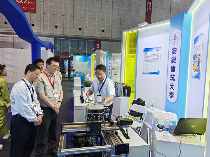 为推动科技成果与市场需求精准对接,深化产学研协同创新,展会设置了高校科技成果展区。高校科研成果展示区汇集了来自北京大学、复旦大学、上海交通大学、西北工业大学等68所高校精心遴选的580项科技创新成果。我校遴选高层建筑快速逃生救援装备和绳驱动无源抗干扰起重装备两项科技成果参展。
