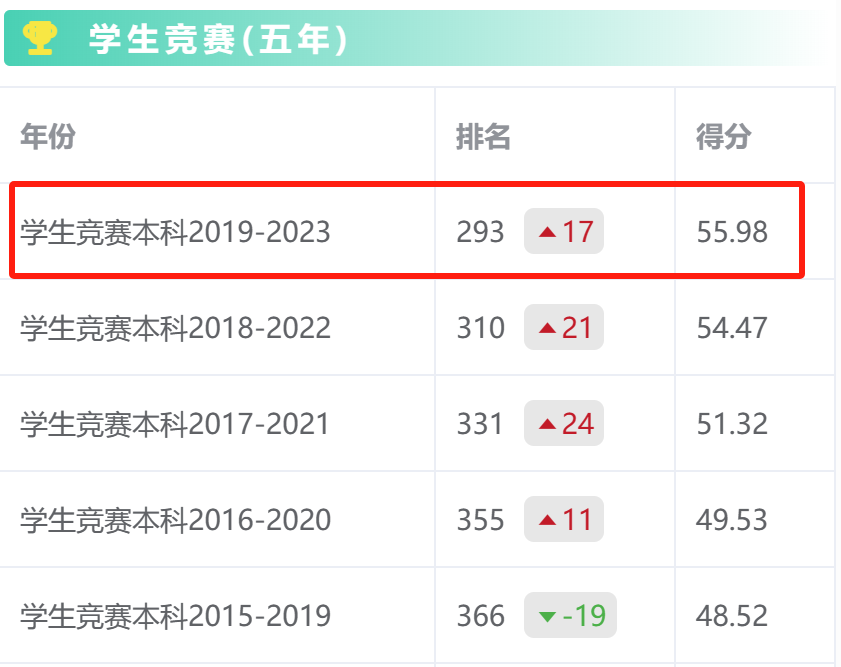本网讯 近期,高校学生竞赛与教师发展数据平台发布2023年度学科竞赛排行榜单,2019-2023年5年学科竞赛综合排名首次进入了TOP300,位列全国293位,较2015-2019年上一个5年提升了73位,其中2023年单年度竞赛排名提升至215位,较2022年提升75位。学校学科竞赛综合实力得到了显著提升。