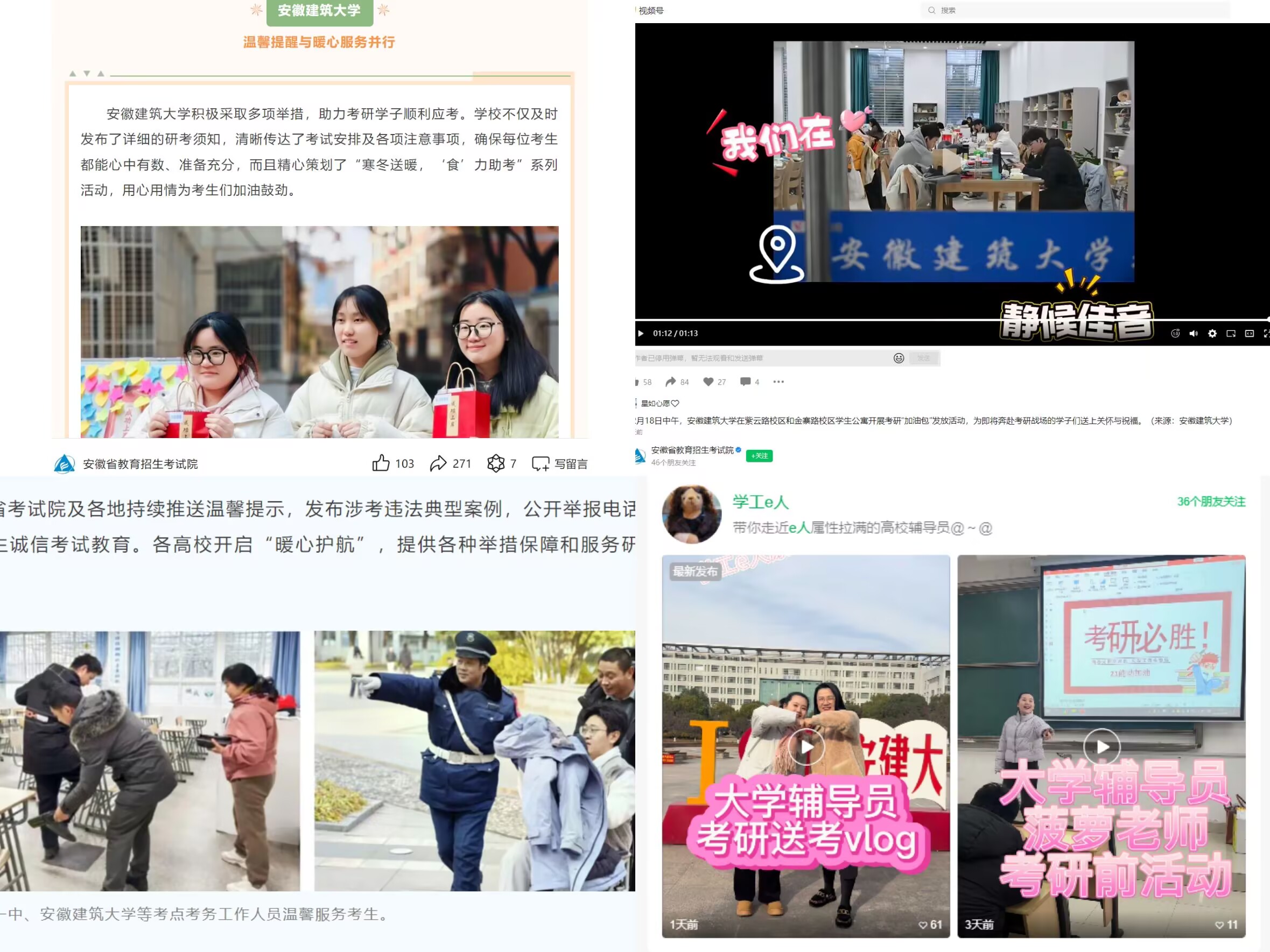 学校各部门、各学院积极践行“研考精神”,紧密锚定考生需求,开展多元化暖心服务。后勤处精心组织开展“寒冬送暖,‘食’力助考”等系列暖心服务举措,向全体考生提供免费早餐和冬至节令餐饮,发放免费午餐券,赠送文具、保暖手套、围巾、水果等备考“加油包”,在各考区提供姜茶、能量食品,为考生加油鼓劲;呼应考生反馈,设置午间休息室,增加考场空调开放时间,设立研考专用绿色窗口方便各校区入校考生就餐、休息。学生处、各学院举行考前动员会、学生座谈会、宿舍走访等形式多样的活动,为考生减压赋能。各学院开展各具特色的考前送祝福、发放大礼包等暖心活动,金寨路校区各学院开通送考专车,建规学院教师连夜加班为入校考生设计专用地图。全校教职工用心用情优化服务,为考生提供温馨舒适的考试环境。